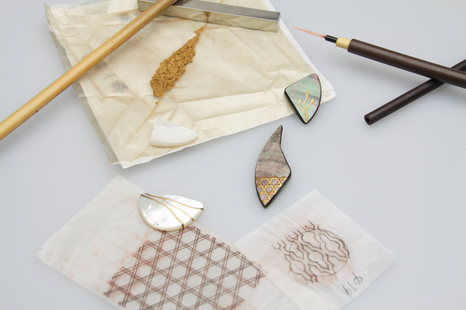 工房でいつも制作している中で、蒔絵ジュエリーの木地として使用している美しい白・黒蝶貝の端材の中から好きな形を選び、漆を用いて金粉を蒔く「蒔絵」か、もしくは夜光貝や銀切金を用いて過食する「螺鈿」という技法を体験し、ピンブローチまたはペンダントを作ります。