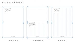 このプロジェクトのために3種類の原稿用紙を用意しました。お好きなパターンをお選びいただきお申し込みください。(1セット30枚入り)