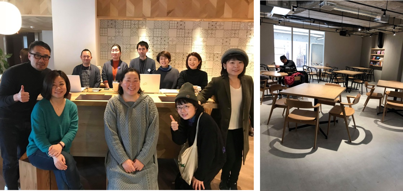 (左:RAKUROフロントにてスタッフ達と一枚! 右:RAKUROのLibrary & Loungeで情報収集中)
