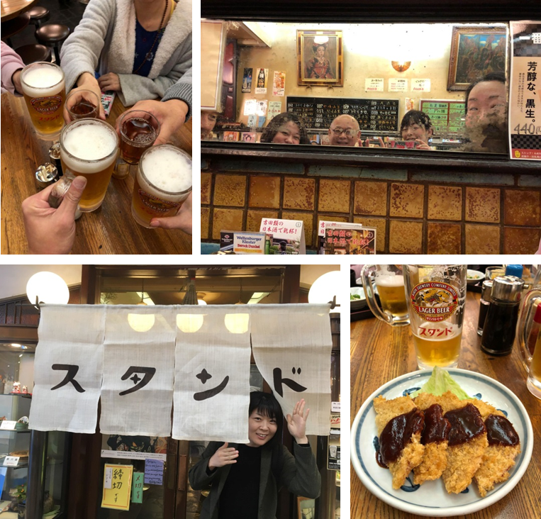 1日目の昼食は創業昭和2年、新京極通りにある食べ呑みできる昭和の大衆食堂「京極スタンド」にて乾杯!オリジナルブレンドソースがかかったぺらっぺらな味わいあるハムカツも、もちろんいただきます。